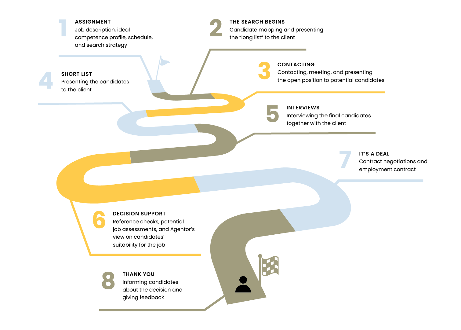 Headhunting offers both parties in a recruitment process the opportunity to find each other, creating a confidential starting point for discussions. In an interactive recruitment process, the recruiter can at an early stage identify the applicant’s skill set, motivational factors, and other key issues, which affect a potential job change. This way, neither party’s time is wasted. Agentor allows managers to focus on the essentials in the recruitment process and frees up company time for core activities.