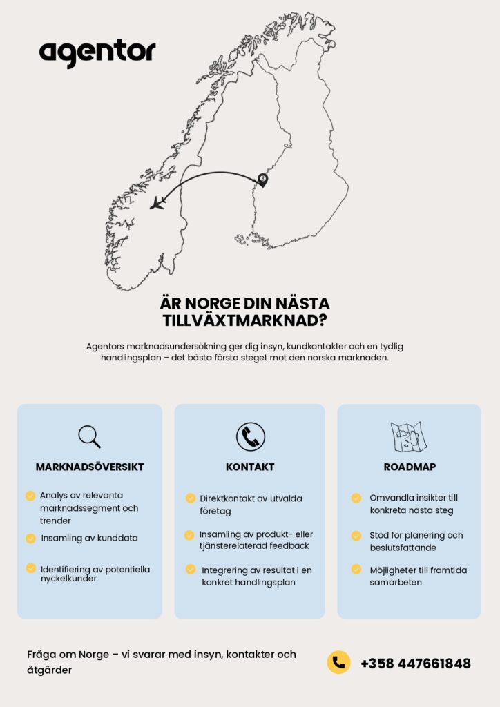 Vi hjälper dig att kartlägga den norska marknaden och etablera första kontakten med potentiella kunder. Tjänsten passar företag som planerar expansion till Norge och behöver lokal insikt och relevanta affärskontakter. Vi fungerar som din partner i det tidiga skedet av marknadsinträdet.